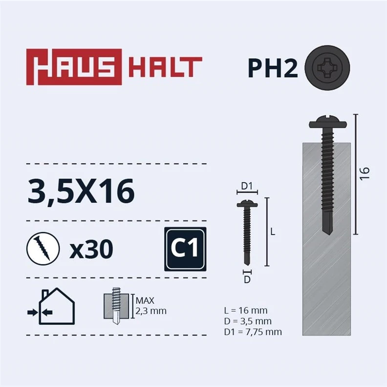 Prekės ženklas- Haushalt. Artikulas- DIN 14566. Savisriegių tipas- Su grąžteliu . Ilgis- 16 mm. Skersmuo- 3.5 mm. Padengimas- Fosfatuotas. Tvirtinama medžiaga- Metalas. Standartas- DIN 14566. Vienetai pakuotėje- 30.