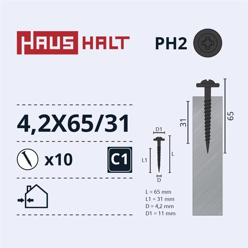 Prekės ženklas- Haushalt. Artikulas- DIN 14566. Savisriegių tipas- Paprastieji. Ilgis- 61 mm. Skersmuo- 4.2 mm. Padengimas- Fosfatuotas. Tvirtinama medžiaga- Metalas. Standartas- DIN 14566. Vienetai pakuotėje- 10. Papildoma informacija- 4.2 x 61/31 mm.