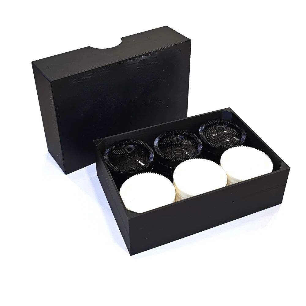 24 PLASTMASAS DAMBRES: 12 melnas un 12 baltas dambretes der 51 cm. lai aizpildītu spēles dēli. Katra gabala diametrs ir 4,5 cm.