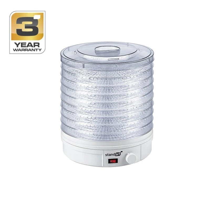 Prekės ženklas- Standart. Modelis- FD770. Plotis- 325 mm. Gylis- 325 mm. Aukštis- 380 mm. Tūris- 4.5 l. Svoris- 3 kg. Spalva- Balta. Korpuso medžiaga- Plastikas. Galia- 350 W. Padėklų skaičius- 9. Padėklų skersmuo- 280 mm. Padėklo aukštis- 35 mm. Darbinė temperatūra- 35 - 70°C. Nustatoma temperatūra- 7 lygiai. Apsauga nuo perkaitimo- Taip. Valdymas- Mechaninis. Laikmatis- Ne. Ekranas- Ne. Komplekte- 9 padėklai. 2 tinkliniai padėklai vaistažolėms ir prieskoniams.. Privaloma garantija- 24 mėn.
