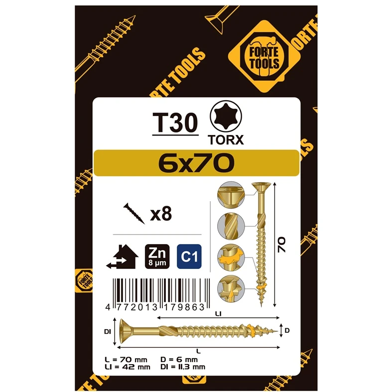 Prekės ženklas- Forte Tools. Medsraigčių tipas- Universalieji. Galvutės tipas- Įleidžiama. Padengimas- Cinkuota. Spalva- Geltona. Ilgis- 70 mm. Skersmuo- 6 mm. Galvutės įpjovos tipas- Torx. Vienetai pakuotėje- 8.