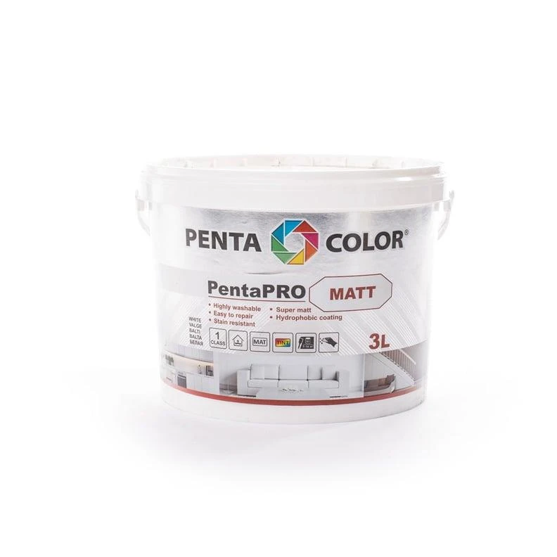 Prekės ženklas- Pentacolor. Modelis- Wall 3. Kiekis pakuotėje. l- 3. Dažų tipas- Emulsiniai. Blizgumas- Visiškai matinis. Skiediklis- Vanduo. Skirta apdailos darbams- Vidaus. Dažų paskirtis- Sienoms. Luboms. Dažytų paviršių defektams šalinti. Tinka dengti paviršius- Lakuotą paviršių. Betoną. Gipskartonį. Tapetuotus paviršius. Tinkuotus paviršius. Išeiga- 14 m²/l. Darbo įrankiai- Purkštukas. Džiūvimo laikas (prieš liečiant)- 2 - 2h. Džiūvimo laikas (prieš perdažant)- 3 - 4h. Papildoma informacija- Tipas: emulsija. Itin atspari intensyviam plovimui.
