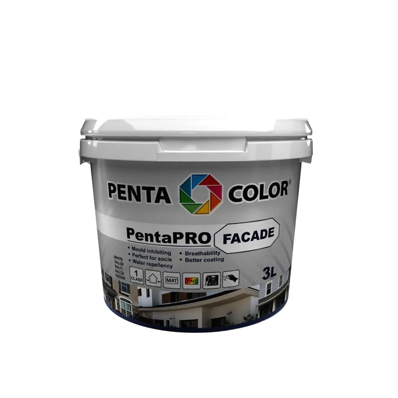 Prekės ženklas- Pentacolor. Kiekis pakuotėje. l- 3. Dažų tipas- Emulsiniai. Dažų spalva- Balta. Blizgumas- Visiškai matinis. Atsparumas drėgnajam šveitimui- 1 stiprumo klasė. Skiediklis- Vanduo. Skirta apdailos darbams- Lauko. Dažų paskirtis- Fasadui. Tinka dengti paviršius- Betoną. Plytų mūrą. Tinkuotus paviršius. Džiūvimo laikas (prieš perdažant)- 3 - 4h. Tinka karščio veikiamiems paviršiams- Ne. Modelis- Facade.