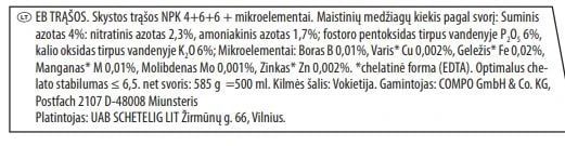 Zīmols- Compo. Tilpums- 0.5 l. Mēslošanas līdzekļa veids- Šķidrums. Paredzēts sezonai- Universāls. Sastāvs- Šķidrais mēslojums NPK 4+6+6+mikroelementi..Barības vielu saturs pēc svara:kopējais slāpeklis 4%, nitrātu slāpeklis 2.3%, amonija slāpeklis 1.7%; fosfora pentoksīds šķīstošs ūdenī P2O5 6%, kālija oksīds šķīstošs ūdenī K2O 6%. Mikroelementi: bors B0.01%, varš *Cu 0.002%.*helātu formā (EDTA).Optimāls helātu stabilitāte ≤6,5.. Uzmanību!- Uz iepakojuma esošo informāciju ir ieteicams saglabāt. Obligātā garantija- 24 mēn. Papildus informācija- 645298 Mēslojums ziedošiem ziediem BLfl 500ml . EK mēslojums. Compo šķidrais mēslojums ziedošiem augiem. Fosfors veicina košas krāsas un ilgstošu ziedēšanu. Pirms lietošanas sakratīt. No marta līdz oktobrim mēslot 1 reizi nedēļā, bet no oktobra līdz martam – 2 reizes mēnesī..Compo kvalitātes garantija nozīmē: augstas kvalitātes Compo mēslojuma sastāvs ir pārbaudīts dārzkopības saimniecībās un atbilst individuālajām auga vajadzībām...