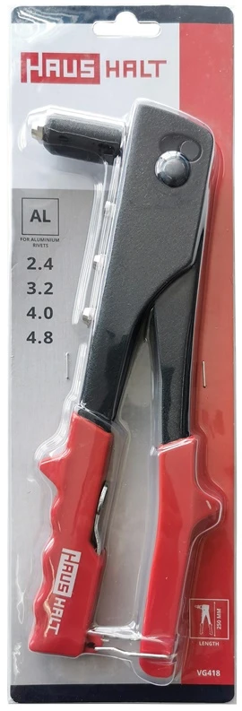 Prekės ženklas- Haushalt. Ilgis- 250 mm. Tinkamų kniedžių dydžiai- 2.4 mm. 3.2 mm. 4.8 mm. 4 mm. Tinkamos kniedės- Aliuminės. Plieninės. Kniediklio galvutės tipas- Fiksuota. Svoris- 0.57 kg.