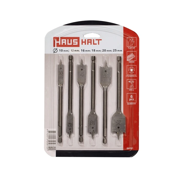 Prekės ženklas- Haushalt. Artikulas- 4542001. Ilgis- 15 cm. Skersmuo- 25 mm. 10 mm. 12 mm. 16 mm. 18 mm. 20 mm. Grąžto tipas- Plunksninis. Tvirtinimo tipas- Šešiakampis. Komplekte- 6vnt. Apdirbama medžiaga- Mediena. Gipskartonis. Plastikas. Garantija- 24 mėn.