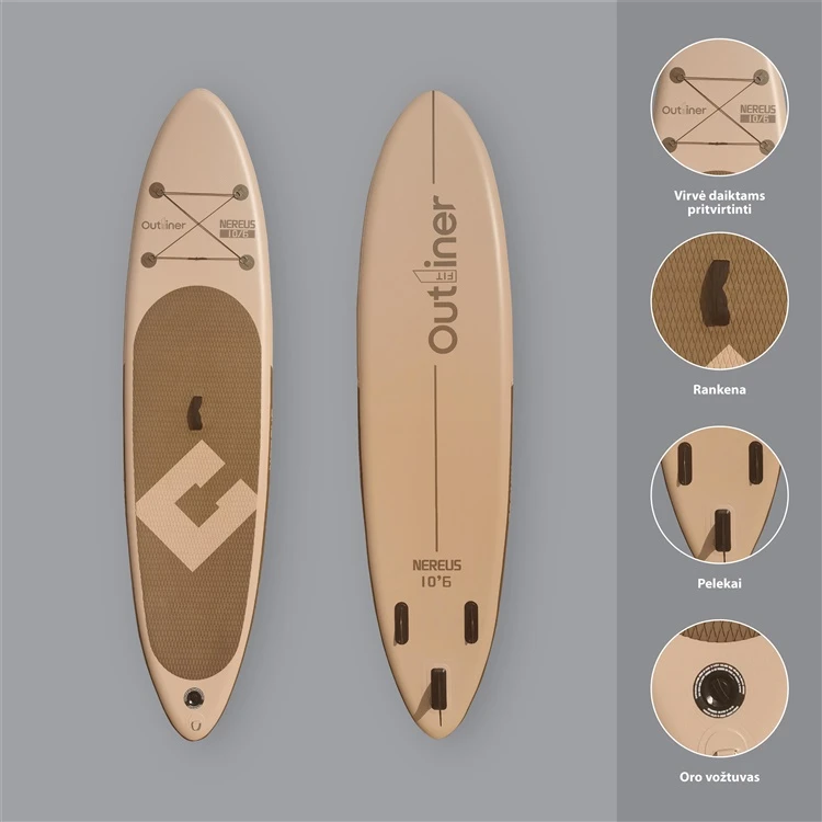 Prekės ženklas- Outliner. Modelis- Muses. Artikulas- RH-MU100W . Ilgis- 320 cm. Plotis- 81 cm. Aukštis- 15 cm. Svoris- 12 kg. Spalva- Aukso. Medžiaga- Polivinilchloridas (PVC). Maksimali apkrova- 120 kg. Papildomos dalys komplekte- • 1 pripučiama „Stand-Up“ irklentė• 1 krepšys• 1 aliumininis reguliuojamas irklas• 1 rankinė pompa• 1 dirželis• 1 nuimamas pelekas• 1 rinkinys remontui. Garantija- 24 mėn. Papildoma informacija- Krepšio-kuprinės matmenys: 96×42×25 cm.