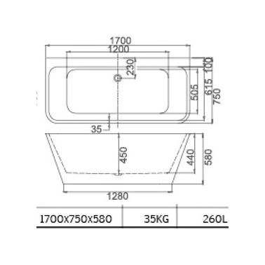 Prekės ženklas- Masterjero. Vonios tipas- Laisvai pastatoma. Medžiaga- Akrilas. Ilgis- 170 cm. Plotis- 75 cm. Aukštis- 58 cm. Forma- Asimetrinė. Spalva- Balta. Svoris- 35 kg. Perbėgimo skylė- Taip. Komplekte- be kojelių. be sienelės. . Sifonas komplekte- Taip. Panelė komplekte- Ne. Su kojelėmis- Ne.