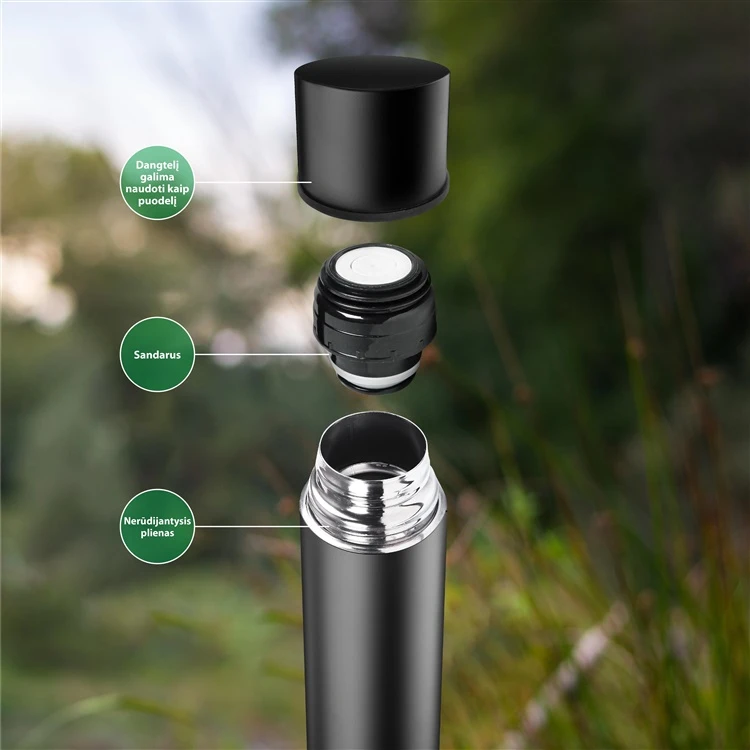 Zīmols- Outliner. Artikuls- TRXG-7919. Augstums- 32 cm. Diametrs- 8 cm. Tilpums- 1 l. Krāsa- Melna. Materiāls- Polipropilēns (PP), Nerūsējošais tērauds. Siltuma saglabāšanās līdz- 24 h. Aukstuma saglabāšana līdz- 12 h. Obligātā garantija- 24 mēn. Papildus informācija- Nesatur BPA. Necaurlaidīgs. Ar dubultām sieniņām..