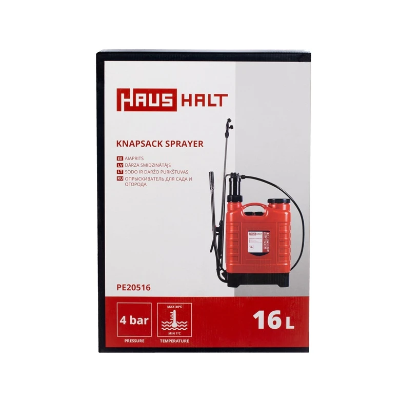 Prekės ženklas- Haushalt. Artikulas- PE20516. Ilgis- 425 mm. Plotis- 200 mm. Aukštis- 500 mm. Talpa- 16 l. Spalva- Raudona. Medžiaga- Plastikas. Teleskopinė rankena- Ne. Purškimo srovės reguliavimas- Taip. Su manometru- Ne. Privaloma garantija- 24 mėn. Garantija juridiniams asmenims- 12 mėn. Papildoma informacija- Matmenys 425x200x500 mm.
