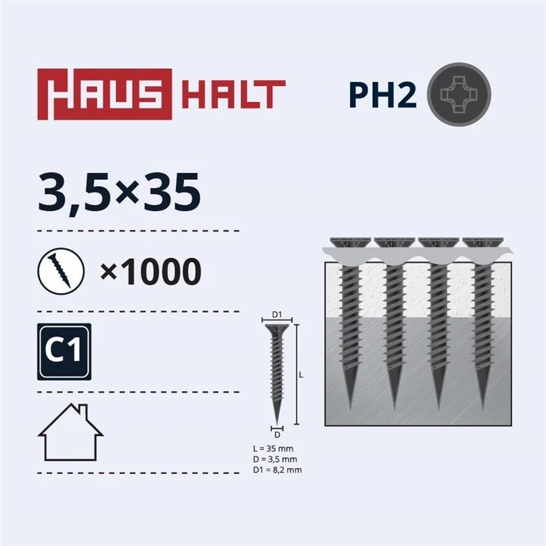 Prekės ženklas- Haushalt. Medsraigčių tipas- Įsukami į metalą. Galvutės tipas- Įleidžiama. Padengimas- Fosfatuotas. Spalva- Juoda. Ilgis- 35 mm. Skersmuo- 3.5 mm. Galvutės įpjovos tipas- Kryžminė. Vienetai pakuotėje- 1000.