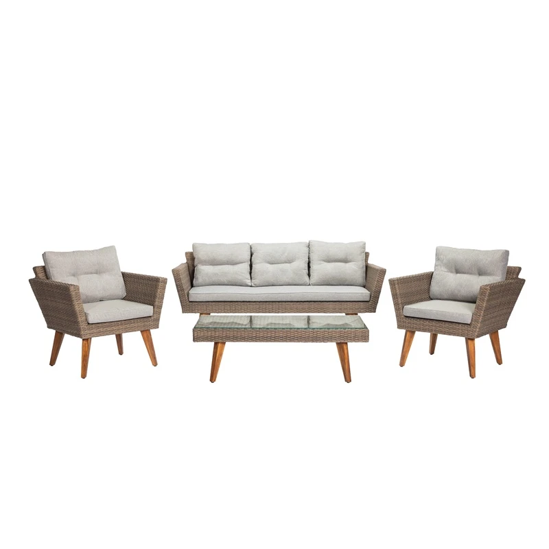 Prekės ženklas- Domoletti. Komplekto sėdimų vietų skaičius- 5 - 5. Stalo ilgis- 95 - 95cm. Stalo aukštis- 36 - 36cm. Stalo plotis- 51 cm. Stalviršio medžiaga- Grūdintas stiklas. Ratanas. Stalas sulankstomas- Ne. Su anga skėčiui įstatyti- Ne. Krėslo ilgis- 76 cm. Krėslo plotis- 70 cm. Krėslo aukštis- 70 cm. Su porankiais- Taip. Kėdė sulankstoma- Ne. Baldų rėmo medžiaga- Medis. Plienas. Medienos rūšis- Akacija. Sofos ilgis- 138 - 138cm. Sofos plotis- 70 cm. Sofos aukštis- 70 cm. Apdailos medžiaga- Ratanas. Baldų komplekto spalva- Pilka. Medžio. Lauko baldų komplekto dalys- 2 krėslai. 1 centrinis sofos segmentas. 1 kavos staliukas. Baldų pagalvėlės komplekte- Taip. Baldų pagalvėlės užpildas- Silikono pluoštas. Baldų pagalvėlės užvalkalas- Poliesteris. Garantija- 24 mėn.
