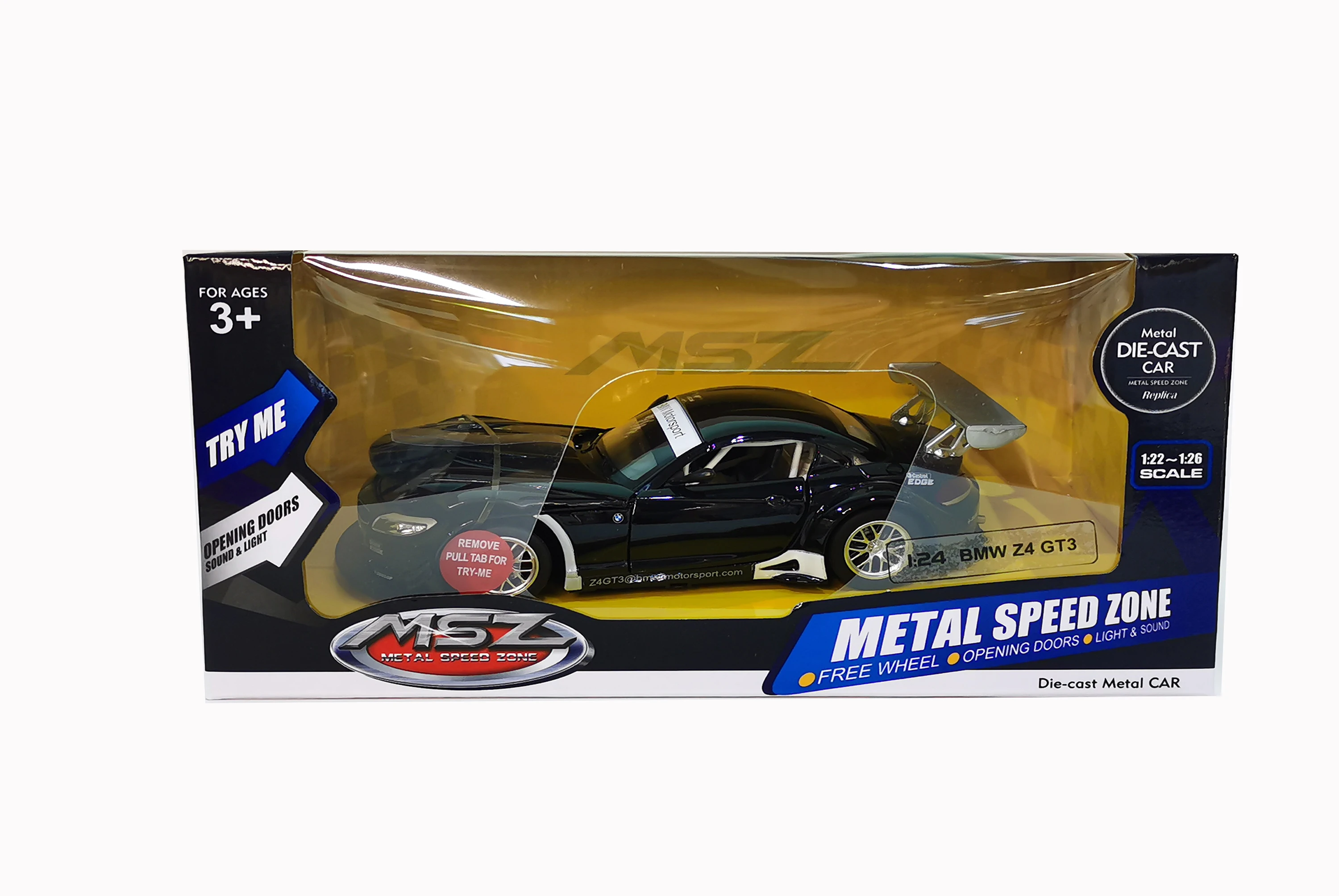 MSZ – tai aukštos kokybės licencinių transporto priemonių modelių asortimentas. Prekių ženklas glaudžiai bendradarbiauja su daugiau kaip 30 garsiausių pasaulyje transporto priemonių gamintojų, įskaitant LAMBORGHINI, BENTLEY, AUDI, PORSCHE, LAND ROVER ir savo asortimente turi įvairių skalių modelių. Šis modelis – tai 1:24 skalės juodos spalvos automobilis su laisvai besisukančiais ratais, šviesomis ir garsais, atsidarančiomis durelėmis, variklio gaubtu ir bagažinės dangčiu.