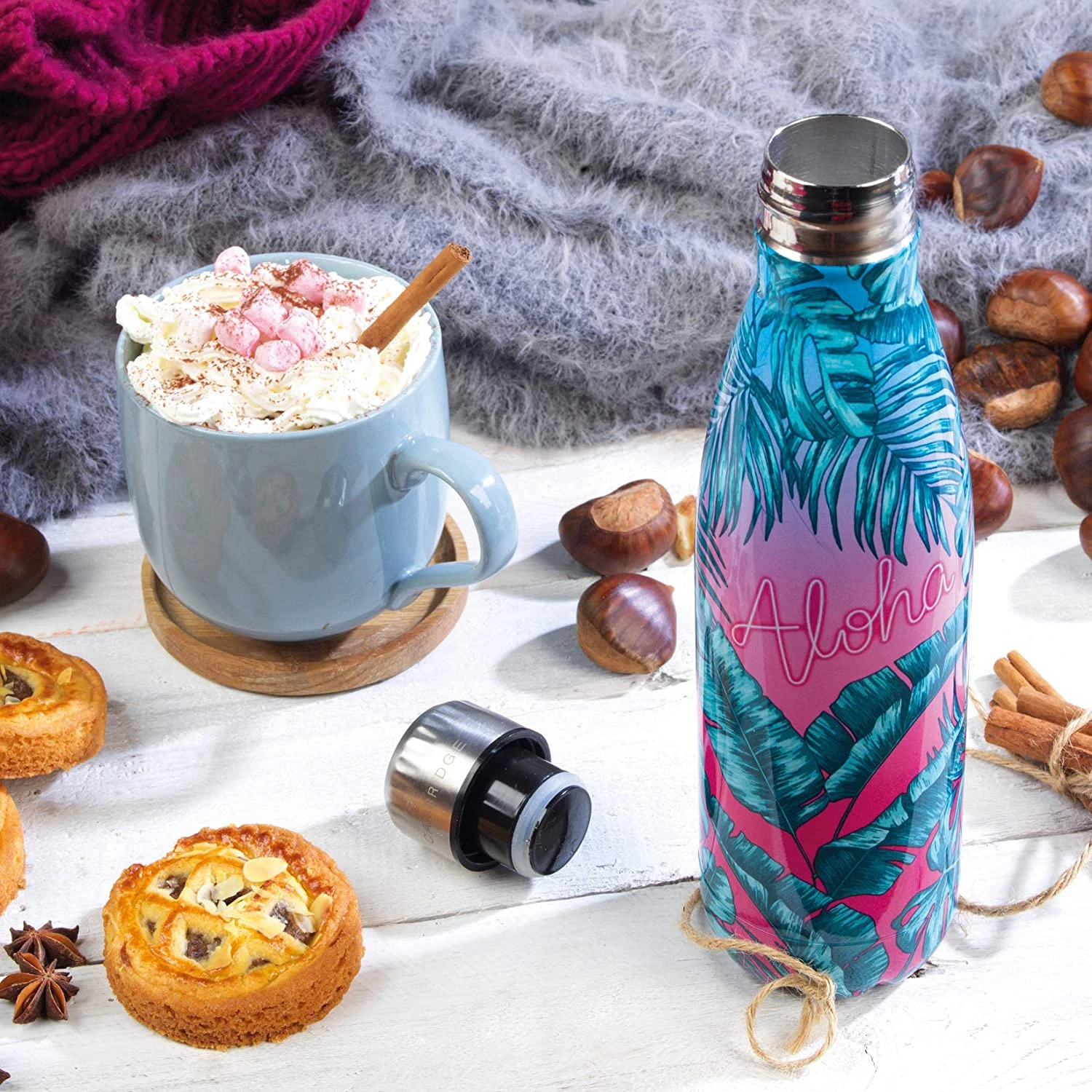 Stilingas, funkcionalus ir daugkartinio naudojimo kelioninis vandens butelis turi gražų palmės dizainą su 80-ųjų neoninio stiliaus užrašu „Aloha“.