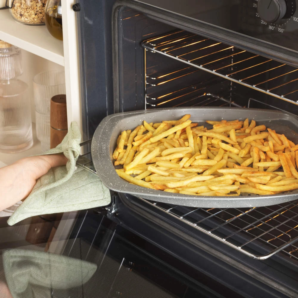 Saugu kepti orkaitėje: sukurta tolygiai šildyti maistą, kad kaskart būtų pasiekti puikūs kepimo rezultatai, ši skarda tinkama naudoti orkaitėje iki 220 °C temperatūroje.