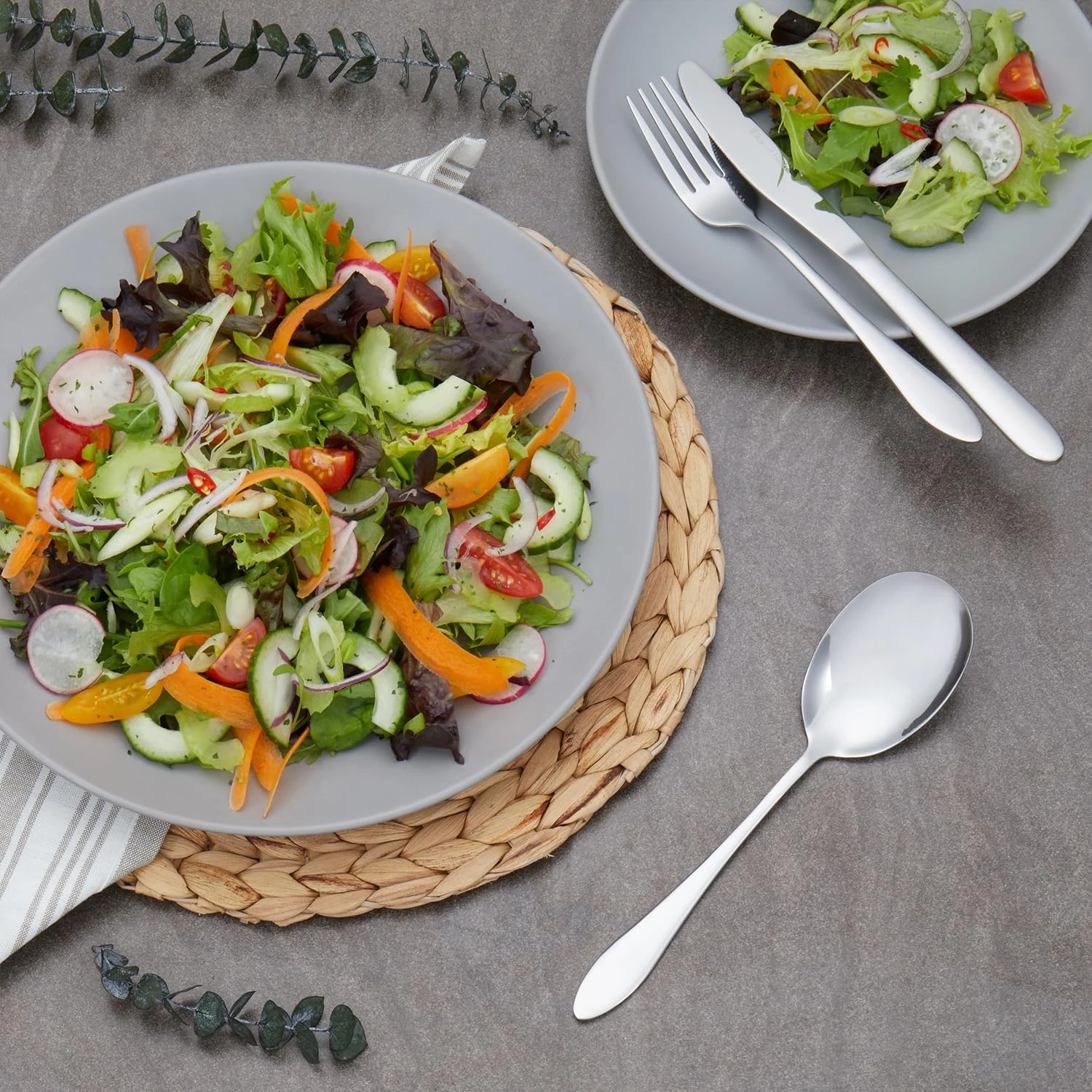 Taip pat yra šešios desertinės šakutės ir peiliai, šeši sriubos šaukštai ir du serviravimo šaukštai, kurie idealiai tinka vakarienei.