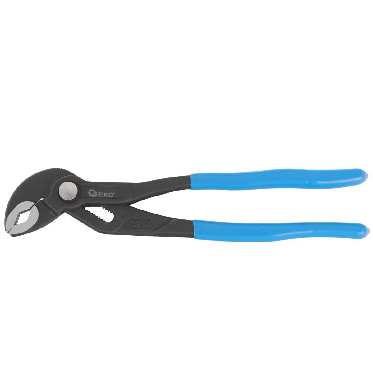 Regulējamās cauruļu knaibles ar pogu ir instruments, kas paredzēts, lai palielinātu komfortu un efektivitāti darba laikā. Īpaši praktiskas knaibles nodrošina ātru un precīzu regulēšanu, pielāgojoties dažāda izmēra caurulēm un citiem priekšmetiem ar vienu vienkāršu kustību, pateicoties inovatīvai pogai. Pateicoties šai unikālajai funkcijai, optimāla pielāgošana satvertajiem objektiem tagad ir vienkārša un intuitīva. Šo knaibļu svarīgākā priekšrocība ir pašsavienošanās uz caurulēm un uzgriežņiem, kas garantē izcilu saķeres stabilitāti. Nav jāuztraucas par iespējamu iespīlēšanas žokļu izslīdēšanu. Pateicoties tam, ievērojami palielinās darba ar instrumentu efektivitāte. Knaibļu dizains ir papildus bagātināts ar īpaši rūdītām spīlēm, nodrošinot ne tikai izturīgu un drošu satvērienu, bet arī izcilu nodilumizturību. Izgatavotas no izturīga CrV instrumentu tērauda. Kopējais garums 250 mm.