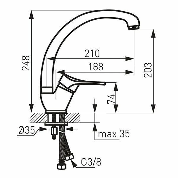 Prekės ženklas- Ferro. Modelis- BPT4A. Montavimo tipas- Montuojamas ant paviršiaus. Ilgis- 21 cm. Plotis- 3.5 cm. Svoris- 1.02 kg. Aukštis- 24.8 cm. Spalva- Chromo. Medžiaga- Varis. Žalvaris. Jungtis- 3/8 colio. Kasetė/maišymo sistema (cartridge)- 3.5 cm. Pralaidumas- 15 l/min. Rankenėlių skaičius- 1. Su dušo žarna- Ne. Ištraukiama galvutė- Ne. Lanksti galvutė- Ne. Su dušo galvute- Ne. Garantija- 24 mėn. Komplekte- Lanksčios jungtys G3/8 - M10x1 (2 vnt.). Papildoma informacija- Pasukamas snapas.