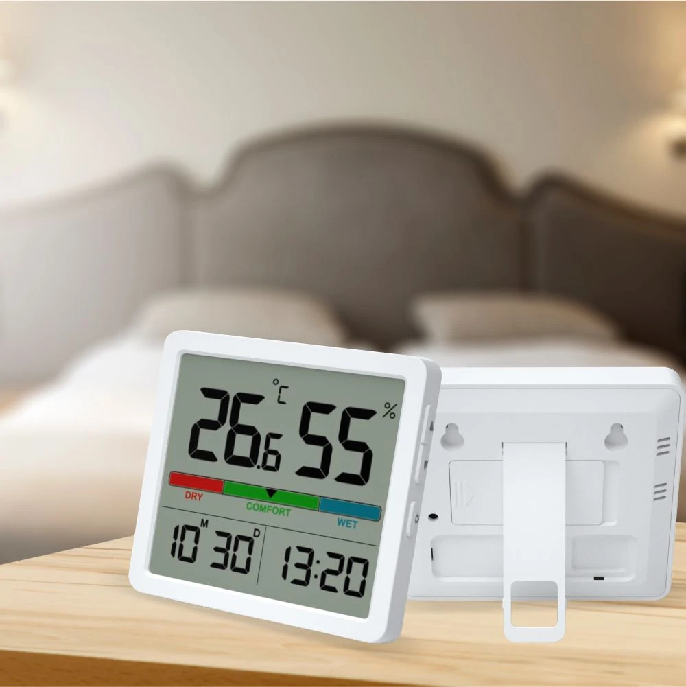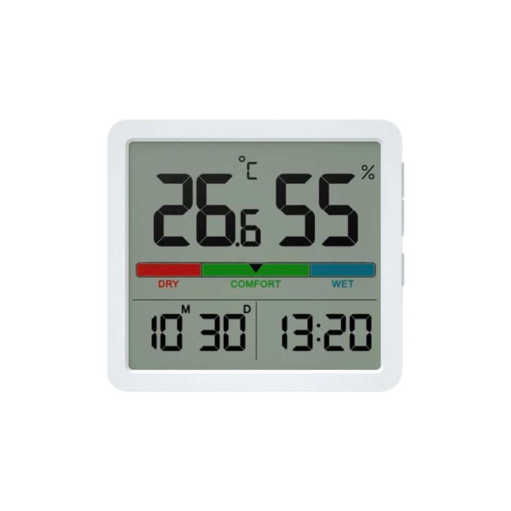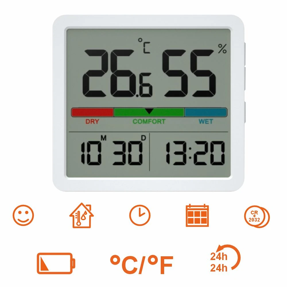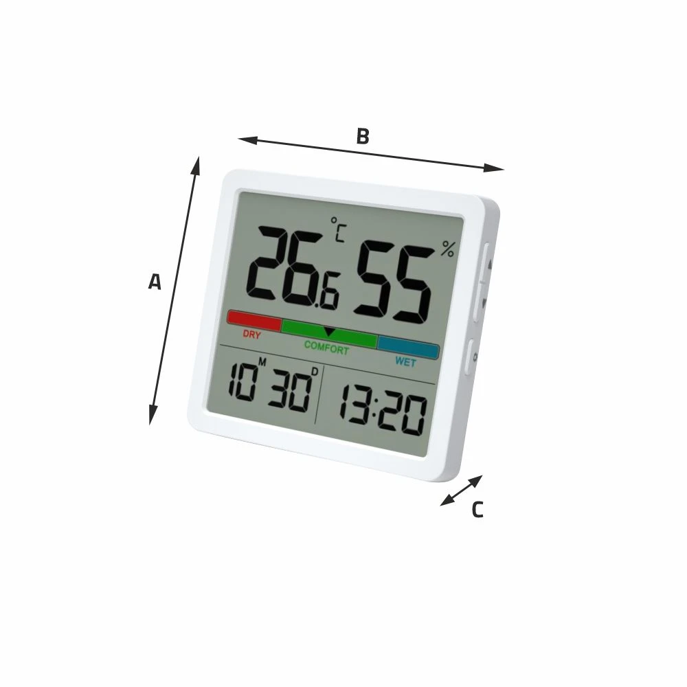 Savybės: termometras, higrometras, laikrodis, datos ekranas, komforto indikatorius