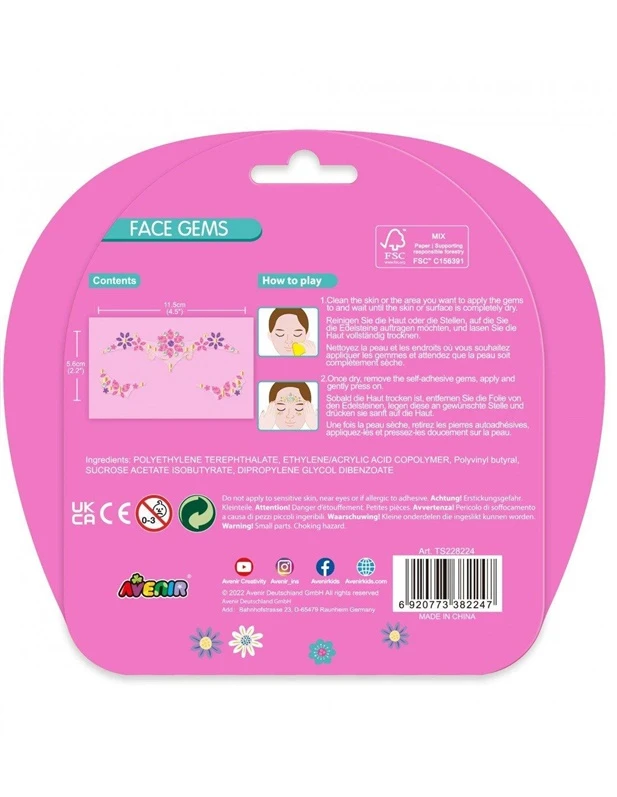Zīmols- Avenir. Artikuls- TS228224. Krāsa- Rozā. Materiāls- Plastmasa. Komplekts- Dažādu formu uzlīmes sejai. Ieteicamais vecums no- 3. g.. Uzmanību!- Nav piemērots bērniem, kas jaunāki par 3 gadiem. Satur sīkas detaļas. Aizrīšanās risku.. Obligātā garantija- 24 mēn. Papildus informācija- Lietošanas instrukcija: 1) notīriet ādu vai vietu, uz kuras vēlaties uzklāt dārgakmeņus, un pagaidiet, līdz āda ir pilnīgi sausa; 2) kad tā ir sausa, noņemiet pašlīmējošos dārgakmeņus, uzklājiet un viegli piespiediet..