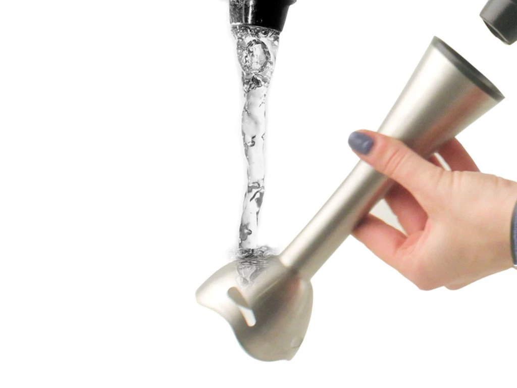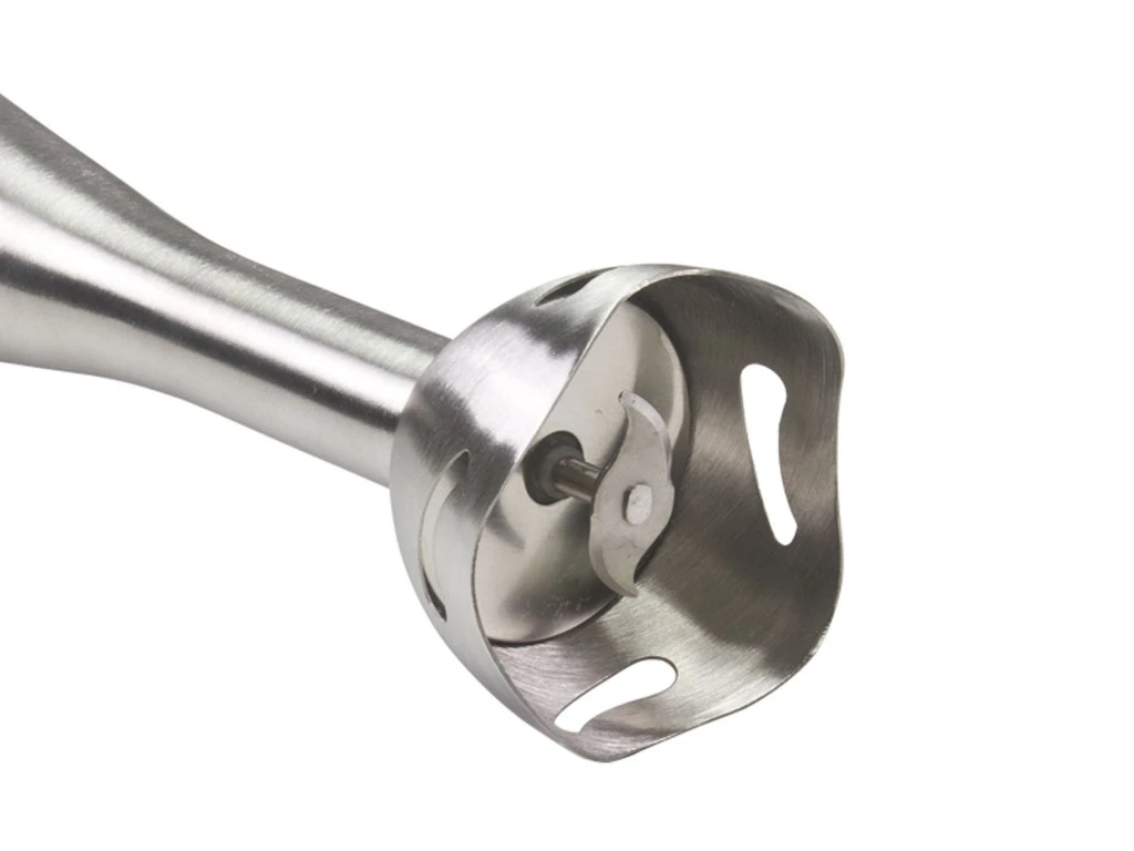 Funkcionalus panardinamasis maišytuvas su guminiu ABS korpusu ir ergonomiška rankena, kad būtų lengva suimti. 19 cm nerūdijančio plieno statinė, kurią lengva valyti, ir dvigubas plieninis peiliukas. 2 greičiai pasirenkami atitinkamais mygtukais. Tiekiamas 650 ml graduotas indelis. Idealiai tinka aksominėms sriuboms ir kompotams ruošti.