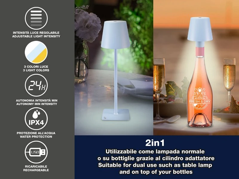 Pridedamas 33 mm buteliuko adapteris yra elegantiška alternatyva staliniam variantui, nes mūsų lempą galima pastatyti ant mėgstamo buteliuko stalo centre.