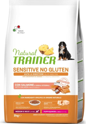 NT DOG Sensitive no gluten Puppy & Junior Medium-Maxi S&R 60gr - pilnvērtīga bezglutēna barība lielo un vidējo šķirņu kucēniem un junioriem, ar lasi.