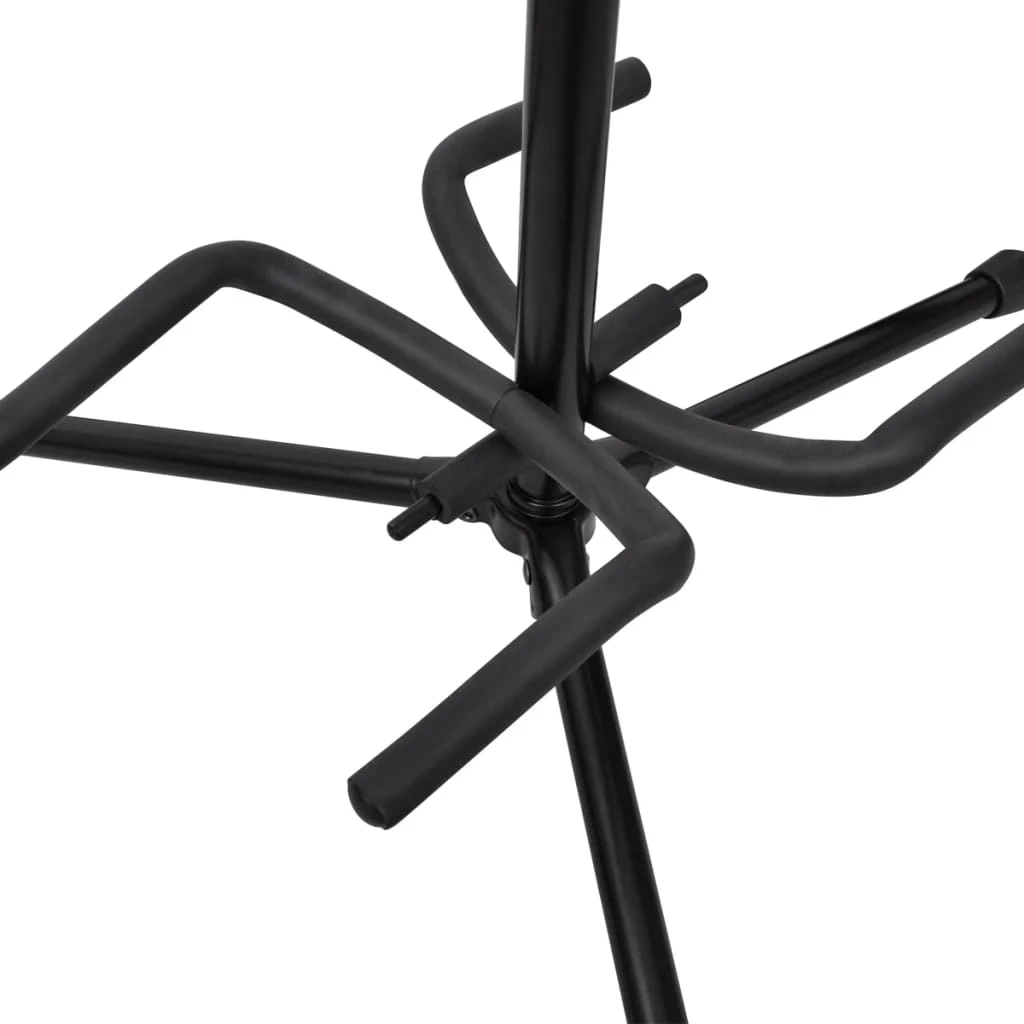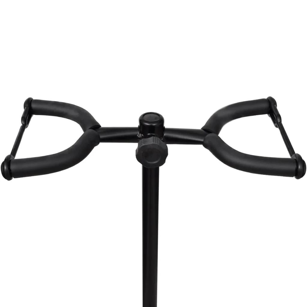 Iš kokybiško plieno pagamintas stovas yra tinkamas bet kokioms gitaroms. Unikalus dizainas leidžia laikyti 2 gitaras ant vieno stovo. Tvirtos konstrukcijos stovas tarnaus daug metų. Nuimamas jungas leis pagal poreikį reguliuoti stovo aukštį, todėl pritaikysite stovą bet kuriai gitarai. Minkšti grifo laikikliai ir laikikliai apačioje apsaugos gitaras nuo pažeidimų. Neslystanti guminė apsauga apsaugos grindis nuo įbrėžimų bei suteiks papildomo stabilumo. Sulankstomą stovą patogu saugoti ir transportuoti.