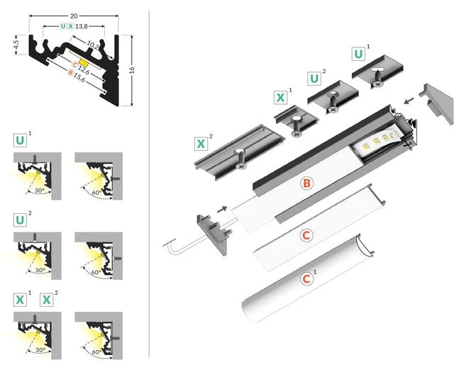 Prekės tipas- LED juostų profiliai. Prekės ženklas- Standart. Kolekcija- CORNER10. Artikulas- F2000601. Spalva- Balta. Ilgis- 200 - 200cm. Aukštis- 1.6 - 1.6cm. Apsaugos laipsnis (IP)- Nėra. Privaloma garantija- 24 mėn. Papildoma informacija- Komplektą sudaro kampinis profilis. profilio dangtelis C (plokščias įstatomas). tvirtinimo detalės ir užbaigimo dangteliai..