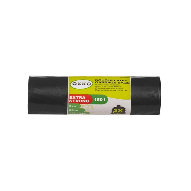 Prekės ženklas- Okko. Talpa- 150 l. Spalva- Juoda. Žalia. Medžiaga- Polietilenas (PE). Kvepiantys- Ne. Vienetai pakuotėje- 5. Papildoma informacija- Dvisluoksniai. Maišo matmenys – 115 x 75 cm. Storis – 60 mikronų..
