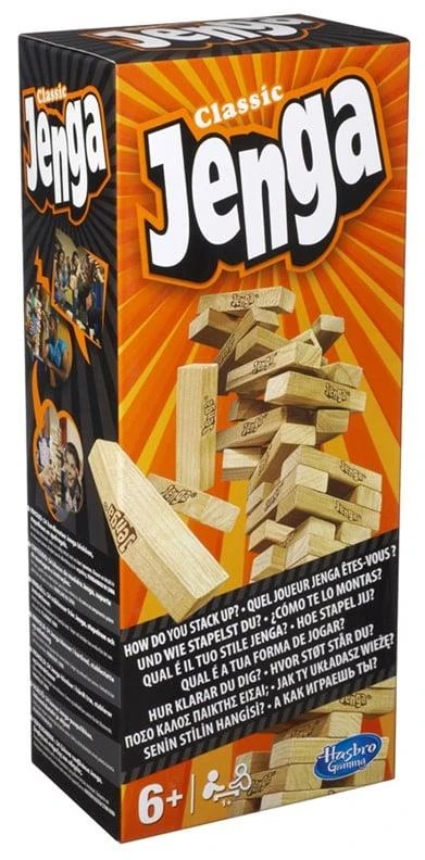 „Hasbro“ žaidimą sau ras kiekvienas! „Jenga“- visame pasaulyje žinomas ir beprotiško populiarumo sulaukęs žaidimas! Jis labai paprastas ir lengvas, tačiau dėl to tik dar smagesnis! Žaidimą gali žaisti net patys mažiausi! Prieš pradedant žaidimą, atsižvelgiant į instrukcijoje pateiktas nuorodas, iš medinių blokelių pastatomas bokštas. Tada žaidėjai paeiliui viena ranka iš bokšto vidurio traukia po vieną blokelį ir uždeda jį ant bokšto viršaus. Tą daryti reikia labai atsargiai, kad bokštas nesugriūtų! Kuo ilgiau žaidžiama, tuo aukštesnis bokštas pastatomas ir tuo sudėtingesnis bei azartiškesnis tampa žaidimas. Norint nepralaimėti, reikia būti įžvalgiam, kantriam, tiksliai atlikti visus judesius ir, be abejo, pasitelkti išradingumą! Žaidimą pralaimi žaidėjas, kuriam ištraukus arba uždėjus blokelį ant bokšto viršaus, bokštas sugriūna. „Jenga“ padeda vaikams lavinti mąstymą, atidumą ir smulkiąją rankų motoriką, o suaugusiems – linksmai praleisti laiką. Žaidimą galima žaisti vienam, su draugu arba visa draugų kompanija. Jis puikiai tinka tiek leidžiant laiką su šeima, tiek audringo vakarėlio metu. Žaidimo „Jenga“ blokeliai pagaminti iš kokybiškos medienos. Žaidėjų skaičius: 1 ir daugiau. Žaidimo trukmė: apie 20 min. Pakuotės dydis (ilgis-plotis-aukštis): 12,9 × 12,9 × 27,3 cm. Rinkinyje yra: 54 „Jenga“ blokeliai, patogi forma bokštui laikyti ir greitai pastatyti, instrukcija. Rekomenduojama vaikams nuo 6 metų.