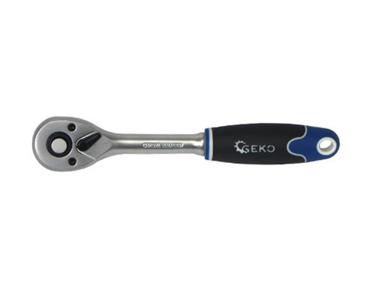 Reversa atslēga 1/4" ar 45 zobiem. Ar īkšķi darbināms atpakaļgaitas slēdzis un ātrās atbrīvošanas poga. Ergonomisks pretslīdes divu materiālu turētājs izturīgam un drošam satvērienam. Hromēta apdare nodrošina pretkorozijas aizsardzību. Aprīkots ar lodīšu fiksācijas mehānismu.
