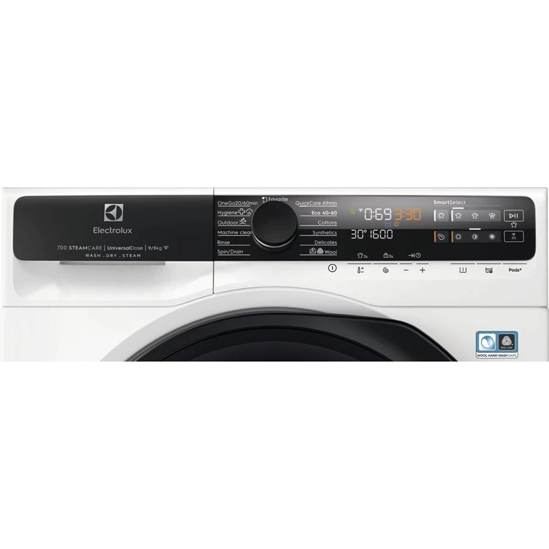 Prekės tipas- Skalbimo mašinos - džiovyklės. Prekės ženklas- Electrolux. Modelis- EW7W5697QE. Plotis- 59.7 cm. Gylis- 57.6 cm. Aukštis- 84.7 cm. Spalva- Balta. Svoris- 77.50 kg. Energinio efektyvumo klasė- A. Elektrinio variklio tipas- Be šepetėlių. Vandens sąnaudos ciklui- 45 l. Gręžimo efektyvumo klasė- A. Skalbimo efektyvumo klasė- A. Skalbimo talpa- 9 kg. Džiovinimo talpa- 5 kg. Gręžimas. aps/min- 1600. Valdymas- Sensorinis. Elektroninis. Išmaniuoju telefonu. Programų skaičius- 14. Skalbimo programos- Quick 20 Wash&Dry 60. Vilnos skalbimo programa. Medvilnė. Sintetika. Gręžimas ir išpumpavimas. Delikati programa. Eco programa. Skalavimo programa. Lauko drabužių programa. MixCare 69min. Higienos programa. Būgno valymas. Ekranas- Taip. Ekrano tipas- LED. Triukšmo lygis gręžiant- 76 dB. Apsauga nuo vandens išsiliejimo- Taip. Programos pradžios atidėjimas- Taip. Vaikų saugos funkcija- Taip. Privaloma garantija- 24 mėn. Papildoma informacija- „Woolmark Blue“ sertifikatas. Speciali skalbyklės valymo programa. Lengvai pasirinksite ar norite skalbti. džiovinti ar ir skalbti. ir džiovinti savo skalbinius. Greita skalbimo ir džiovinimo „OneGo 20/60min“ programa. Inverterinis variklis didesniam našumui ir itin tyliam skalbimui bei 10-ties metų variklio garantija. Glotnus būgno „Care“ raštas dar švelnesnis Jūsų audiniams. Vienu spustelėjimu „SmartSelect“ sureguliuoja skalbimą pagal jūsų poreikius ir sutaupo iki 80 % energijos. 50 % laiko ir 20 % vandens. Unikali technologija „UniversalDose®“. optimizuota visiems skalbikliams. užtikrina 60 % greitesnį skalbimo kapsulių ištirpimą. „Wi-Fi“ - prietaisą galima valdyti išmaniuoju įrenginiu naudojant „My Electrolux“ programėlę. kurioje rasite dar daugiau programų. tarp jų ir programą „Steam Refresh“. Su ja galite rūbais pasirūpinti tarp skalbimų naudodami kvapus „Steam Fragrance“. modelis: E6WMFR020. Garų programa atkuria drabužius garais. sumažina susiraukšlėjimą ir juos reikia mažiau lyginti. Drabužiai ilgiau išlaiko savo fo