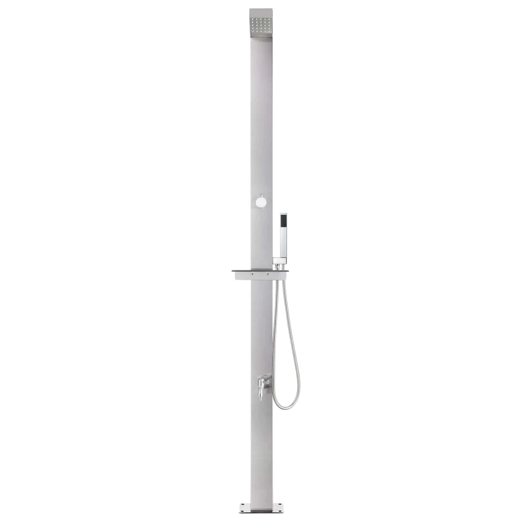 Šis lauko dušas yra pagamintas iš nerūdijančio plieno, kuris užtikrina, kad jis yra atsparus įvairioms oro sąlygoms. Siekiant užtikrinti, kad dušo sistema patenkins jūsų sodininkystės, laistymo ir greito išsiprausimo poreikius, ji turi dušo galvutę, rankinį dušą ir maišytuvą kojoms plauti. Dviguba fiksuojama žarna yra lanksti ir skirta rankiniam dušui. Ji taip pat turi plastikinį rankinio dušo laikiklį ir paprastą vandens žarnos pakabinimą užtikrinančią lentyną.
