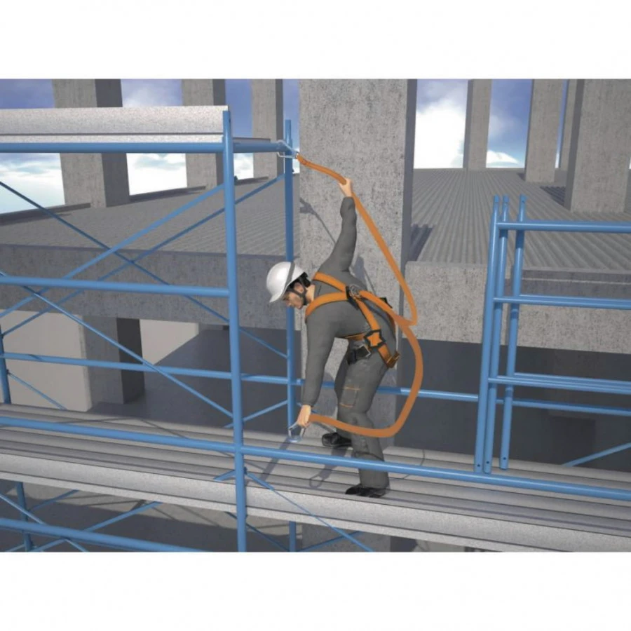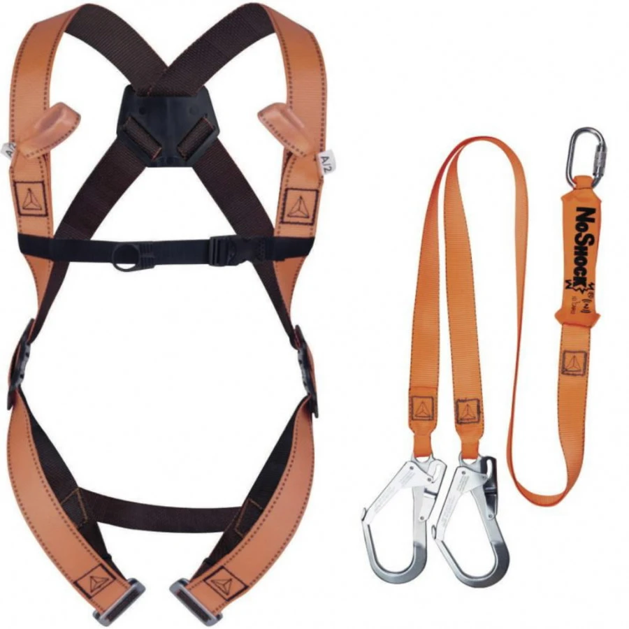 Kritimo apsauga stelažininkams , paruošta naudojimui. Viso kūno diržai su dviem apsaugos tvirtinimo taškais nugaroje ir krūtinės srityje. Energijos absorberis - dviguba 3 juostų virvė (Y) 2m. 1vnt. srieginis karabinas, 2vnt plieniniai kabliai su 62 mm apkabinimu. Saugojimo krepšys.