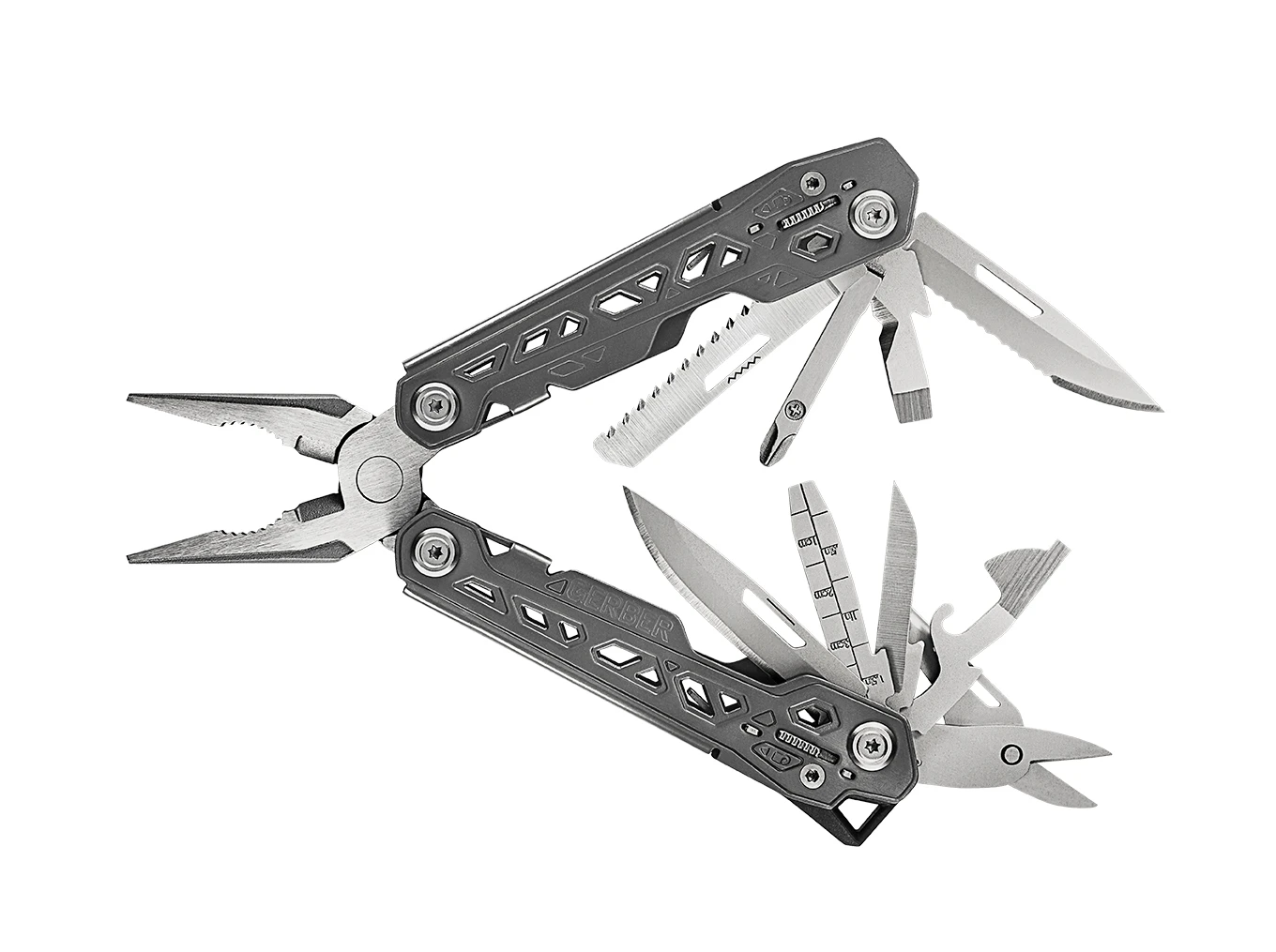 Multiinstruments Gerber Truss - lengvas, kompaktiškas, 17 priedų turintis daugiafunkcis įrankis už patrauklią kainą.<br />Naudingas tiek kelionėse, tiek kasdienėje veikloje - pagrindinės šio įrankio savybės. Universalus, atidaromas dviem rankomis daugiafunkcis įrankis, kuriame visi įrankiai aprūpinti patentuota užrakto mechanizmu, apsaugančiu jūsų delnus nuo atsitiktinių sužalojimų. Įrengtas su aštriais replėmis, vielos pjovikliu, peiliu su lygiais ašmenimis, peiliu su dantytais ašmenimis, pjūklu, nagų žirklėmis, kryžminiu atsuktuvu, mažu ir vidutiniu plokščiais atsuktuvais, konservų dėžutės atidarytuvu, butelių atidarytuvu.