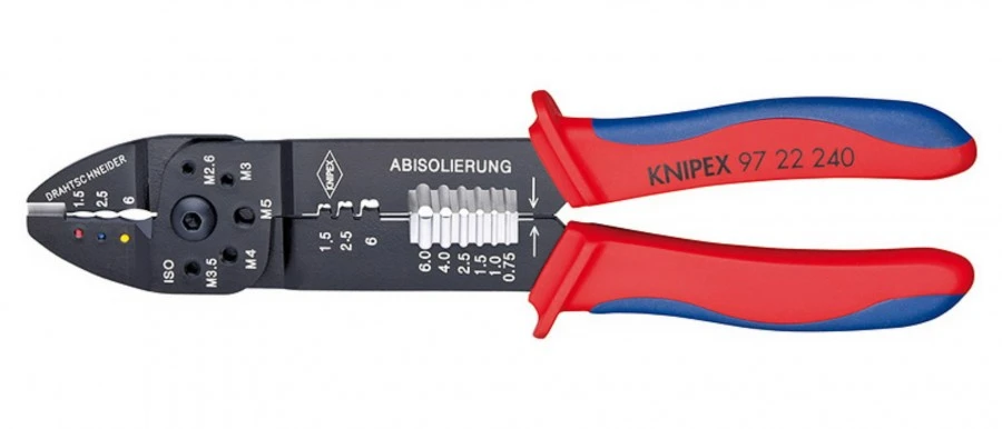 Kabelių nukirpimui, nužievinimui ir izoliuotų bei neizoliuotų jungčių užspaudimui. 3 užspaudimo pozicijos. Apimtis 0.5-6.0mm2..