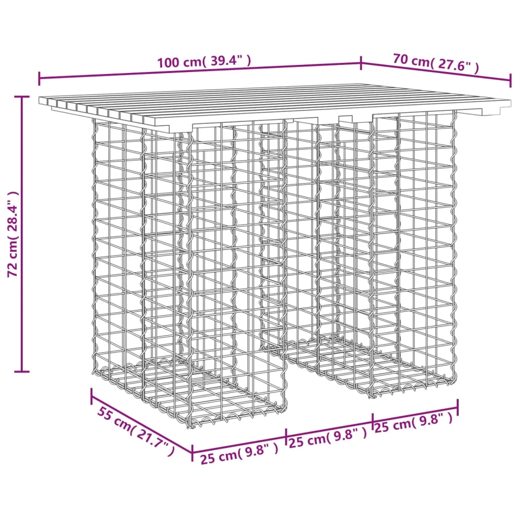 - Tvirtas ir stabilus pagrindas: Šis lauko stalas turi cinkuoto plieno gabiono krepšio pagrindą, kuris skirtas užpildyti akmenimis ir žvyru, kad būtų dar gražiau. Gabiono krepšelio tinklelis kiekvienoje sankirtoje suvirintas skersinėmis ir išilginėmis vielomis, kad būtų užtikrintas didesnis stabilumas.