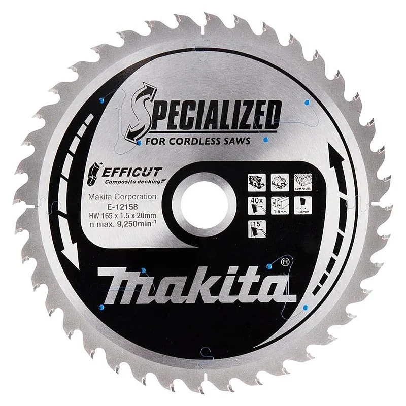Zīmols- Makita. Diametrs- 165 mm. Iekšējā cauruma diametrs- 20 mm. Biezums- 1.5 mm. Zobu skaits- 40. Zobu leņķis- 15 °. Maksimālais ātrums minūtē- 925..