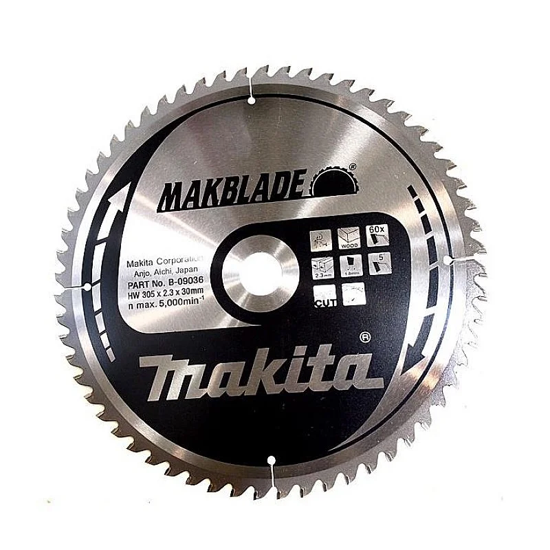 Zīmols- Makita. Artikuls- B-09036 . Diametrs- 305 mm. Iekšējā cauruma diametrs- 30 mm. Biezums- 2.3 mm. Materiāls- Metāls. Zobu skaits- 60. Zobu leņ..