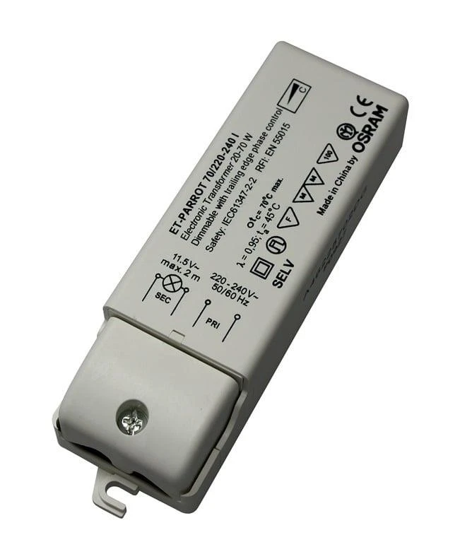Zīmols- Osram. Modelis- ET-Parrot. Ieejas spriegums- 230 - 230V. Izejas spriegums- 11.5 - 11.5V. Maksimālā jauda- 70 W. Garums- 38 mm. Platums- 31 mm. Augstums- 128 mm. Materiāls- Plastmasa. Krāsa- Balta. Obligātā garantija- 24 mēn. Papildus informācija- Var izmantot ar gaismas plūsmas regulatoru.