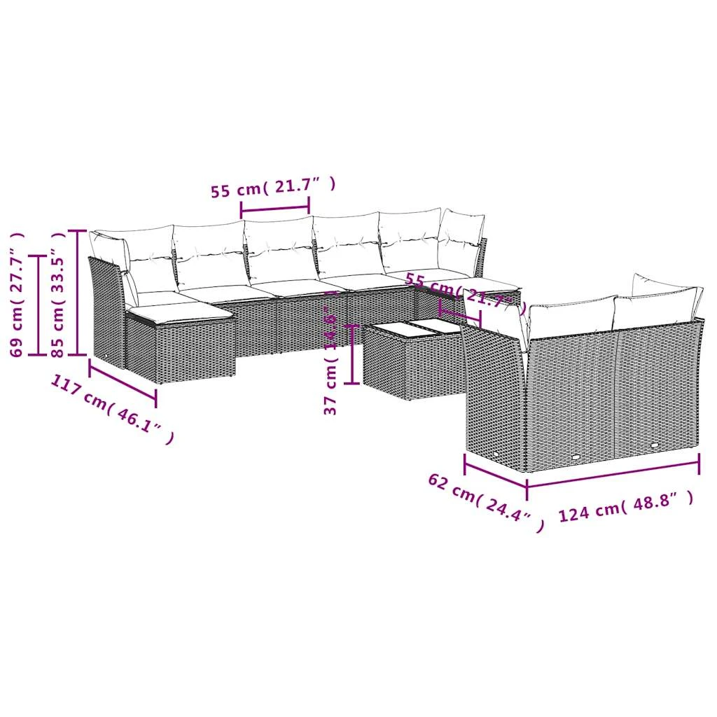 vidaXL 10-daļīgs dārza dīvāna komplekts, matrači, melna PE rotangpalma
