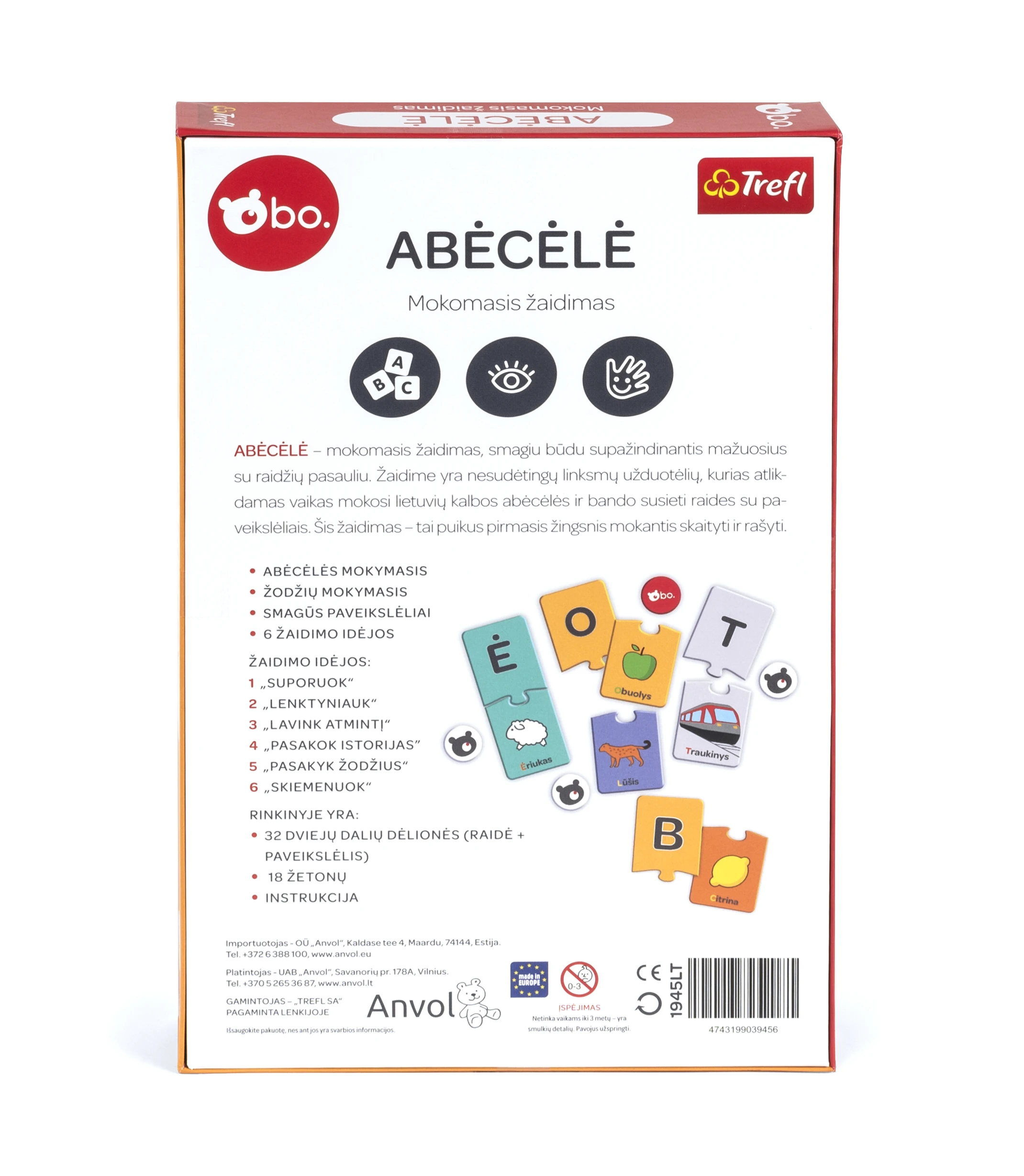 bo. "Alfabēts" ir izglītojoša galda spēle, kas iepazīstina bērnu ar burtu pasauli caur jautru spēli. Spēle ietver vienkāršus un aizraujošus uzdevumus, kuros bērns iepazīst litau valodas alfabētu un salīdzina burtus ar attēliem. Šī spēle ir lielisks pirmais solis uz patstāvīgu lasīšanu un rakstīšanu.