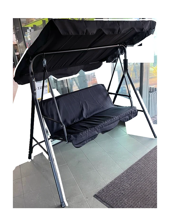 Šūpuļkrēsls ar jumtiņu un 3 polsterētām sēdvietām. Rāmis izgatavots no krāsotām metāla caurulēm. Šūpuļkrēsla garums 153 cm, platums 115 cm, augstums 170 cm.