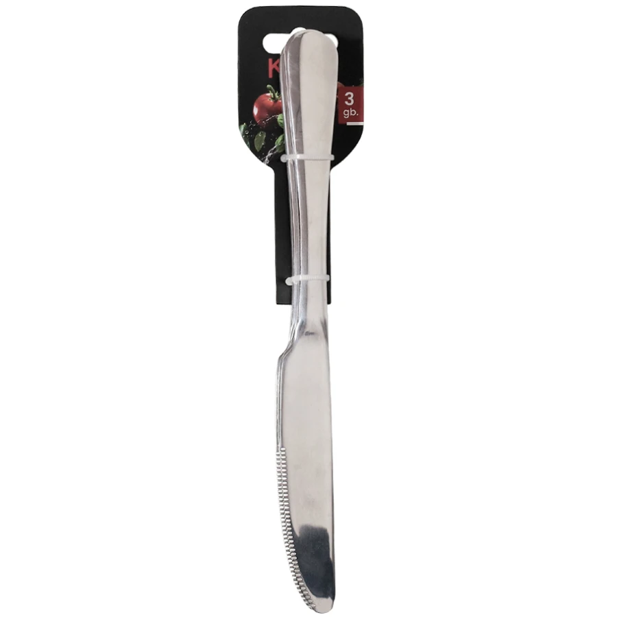 Galda nažu komplekts Diana no Ketler zīmola ir stilīgs un izturīgs risinājums ikdienas lietošanai. Izgatavoti no augstas kvalitātes SUS430 nerūsējošā tērauda, tie nodrošina ilgstošu kalpošanu un izturību pret koroziju. Komplektā ir 3 naži, naža garums 228 mm, kāta biezums 5 mm un svars 75 g, kas nodrošina ērtu un līdzsvarotu satvērienu. Minimālistiskais un elegantais dizains padara tos piemērotus gan ikdienas maltītēm, gan īpašiem gadījumiem. Naži ir viegli tīrāmi un piemēroti trauku mazgājamajai mašīnai, nodrošinot praktiskumu un ērtības jebkurā virtuvē.