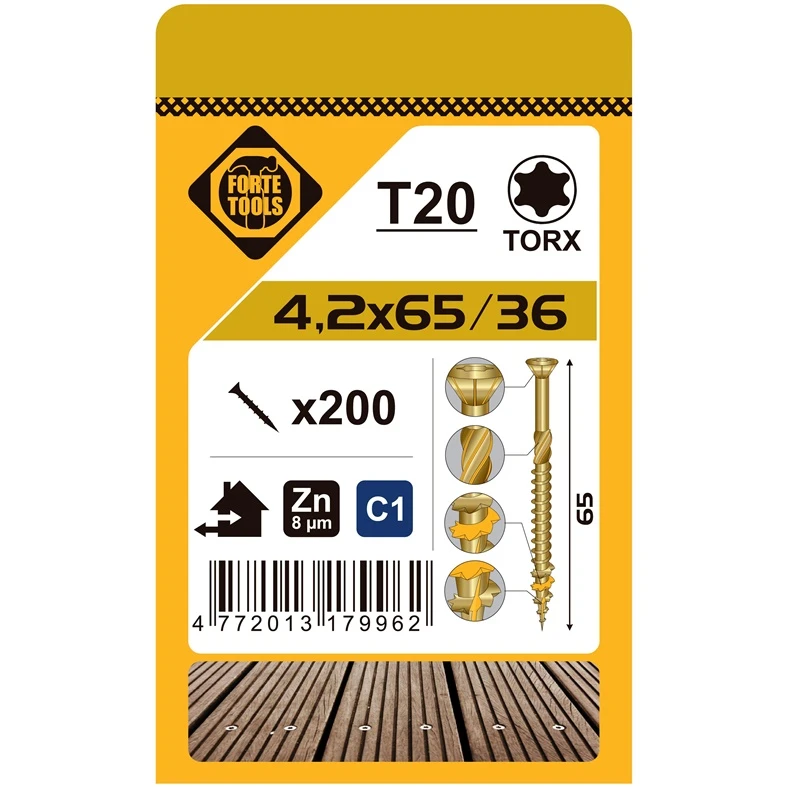 Zīmols- Forte Tools. Skrūves tips- Grīdas. Galvas tips- Padziļinājumā. Pārklājums- Cinkots. Krāsa- Dzeltena. Garums- 65 mm. Diametrs- 4.2 mm. Galvas formas tips- Torx. Vienību skaits iepakojumā- 200.