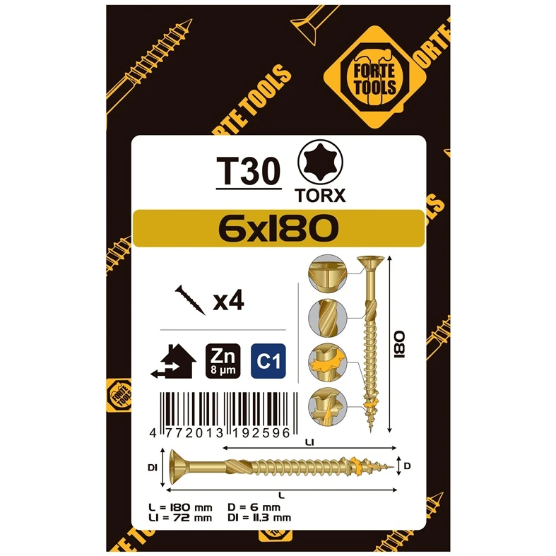 Preču zīmols- Forte Tools. Medsraigu tips- Universālie. Galvas tips- Iegremdējama. Pārklājums- Cinkots. Krāsa- Dzeltena. Garums- 180 mm. Diametrs- 6 mm. Galvas iegriezuma tips- Torx. Vienības iepakojumā- 4. Papildu informācija- Produkta tips: Medskrūves. Skrūves tips: universāls. Galvas tips: iegremdējama. Pārklājums: cinkots. Krāsa: Dzeltena.