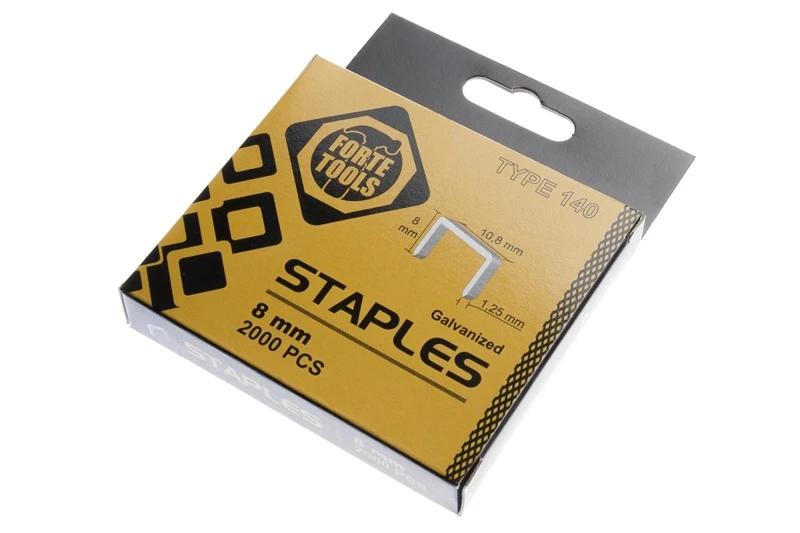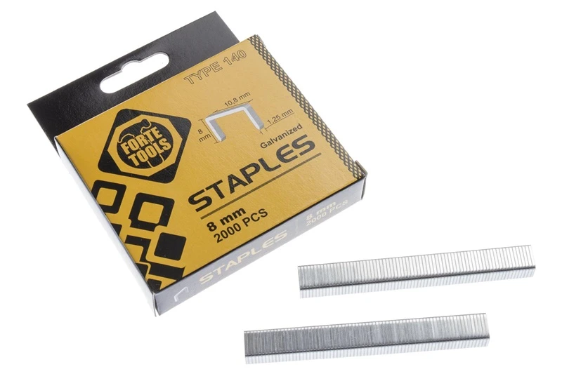 Zīmols- Forte Tools. Artikuls- 1008HD. Garums- 10.8 mm. Platums- 1.25 mm. Krāsa- Sudraba. Materiāls- Metāls. Vienību skaits iepakojumā- 2000. Skavas / Vītnes tips- 140. Papildus informācija- Materiāls: Nerūsējošais tērauds.