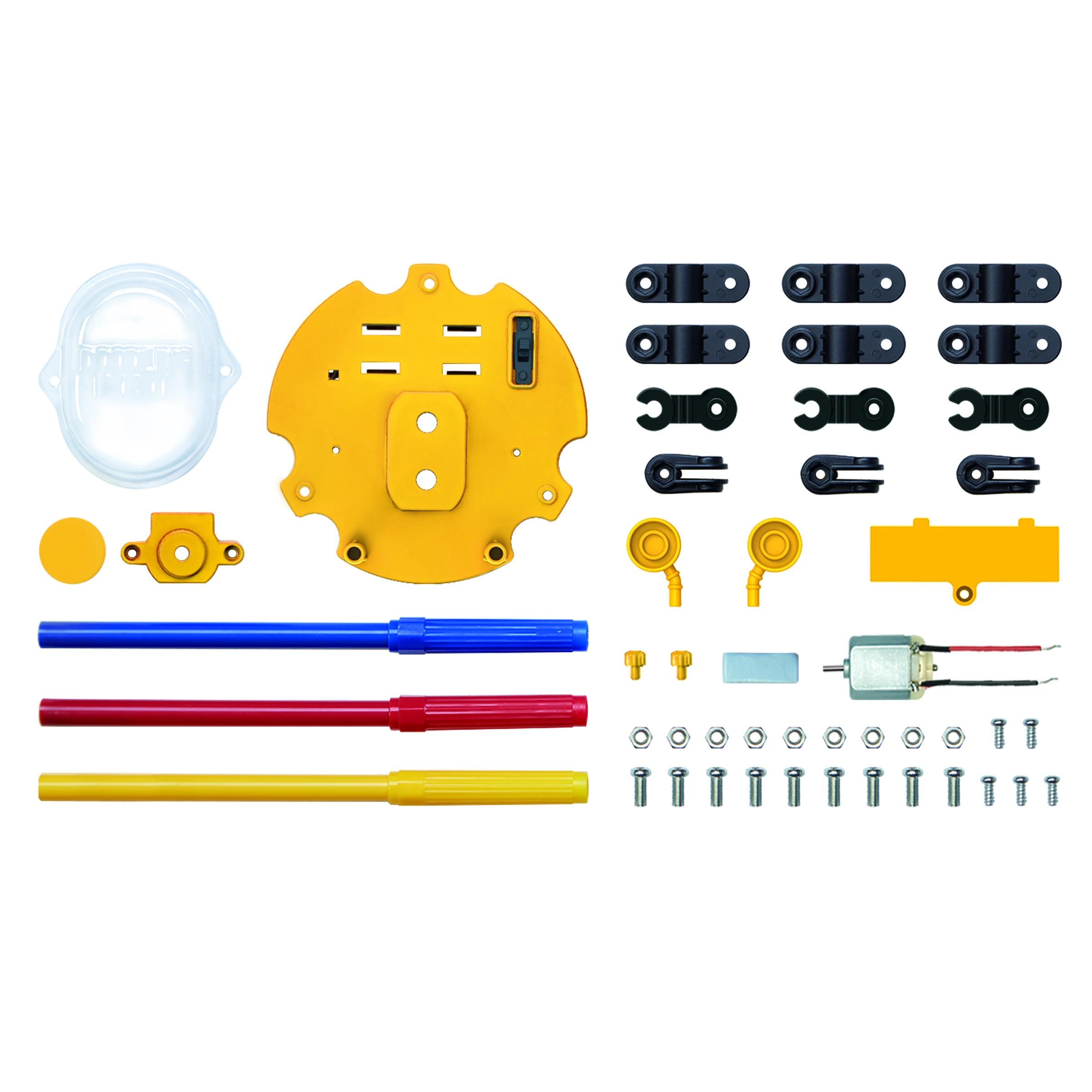 Komplektā: 1 pamata plātne, 1 svari, dažāda veida skrūves un uzgriežņi, 2 spailes, 3 roku balsti, pildspalvu turētāji, 3 roku gali, 1 motoru ar vadiem, 3 pilspalvu turētāju detaļas, 1 motors ar vadiem, 1 caurspīdīgs vāks, 1 motora vāks, bateriju vāciņš, uzlīmes, 2 robotu acis, līmlente , 3 filca tipa pildspalvas un detalizēta instrukcija. Nepieciešamas baterijas: 1x 1,5 V AA (Nav iekļautas komplektā), mazs krustveida skrūvgriezis, lielas papīra lapas.