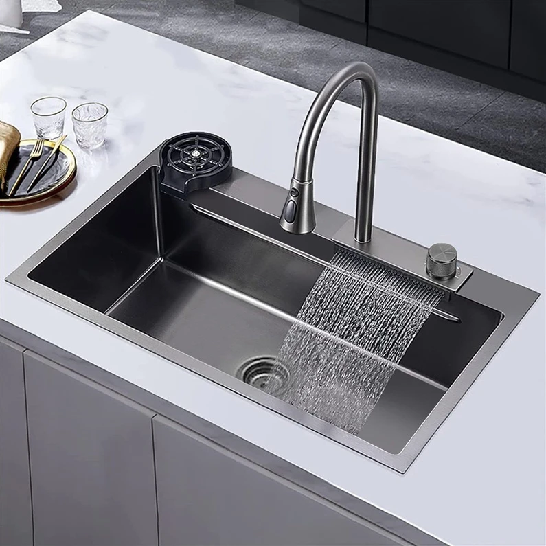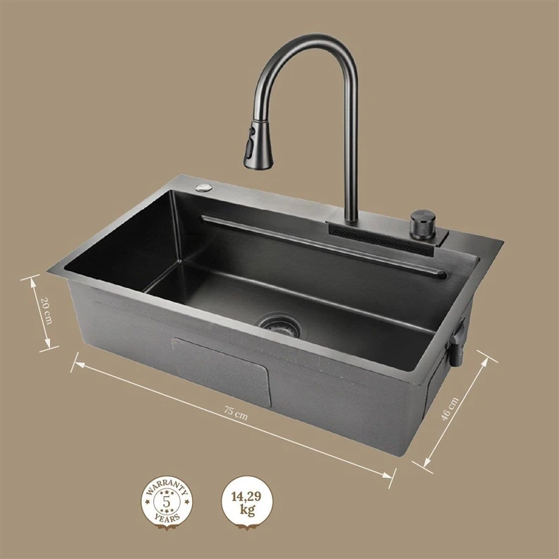 Preču zīmols- Masterjero. Garums- 75 cm. Platums- 46 cm. Dziļums- 20 cm. Svars- 14.29 kg. Forma- Taisnstūris. Krāsa- Pelēka. Materiāls- Nerūsējošais tērauds. Maisītāja caurums- Jā. Pārplūdes caurums- Jā. Uzstādīšanas veids- Virs galda. Ar nosusināšanas daļu- Nē. Ar maisītāju- Jā. Komplektā- Komplektā nerūsējošā tērauda 3 funkciju maisītājs, ūdenskritums, stikla mazgāšanas sistēma, papildu trauks augļu mazgāšanai, nerūsējošā tērauda šļūtenes un savienojumi 3/8’’.. Obligātā garantija- 24 mēn. Papildu informācija- Izlietne pārklāta ar PVD pārklājumu, kas ir noturīgs pret skrāpējumiem..